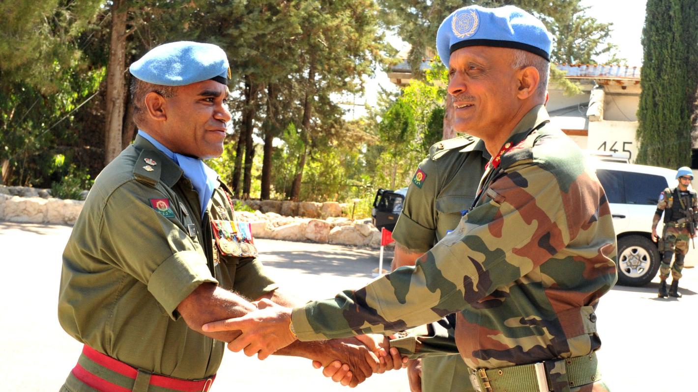 Commanding Officer Fiji Batt Lt Col Ravunakana welcoming the Force Commander and Head of Mission (Chief Guest) Maj Gen Jai Shanker Menon at the Fiji Batt Medal Parade in Camp Fauoar.